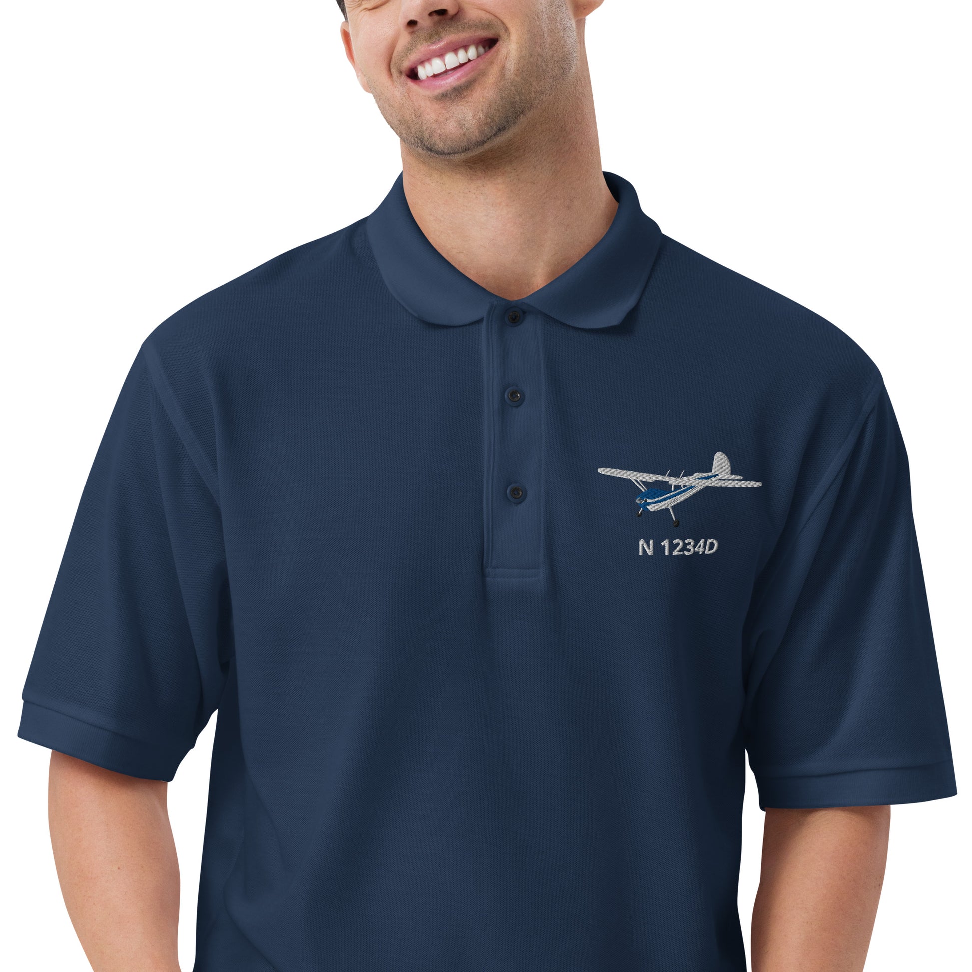CESSNA 140 White-Blue CUSTOM N Number Embroidered Men's Premium Aviation Polo