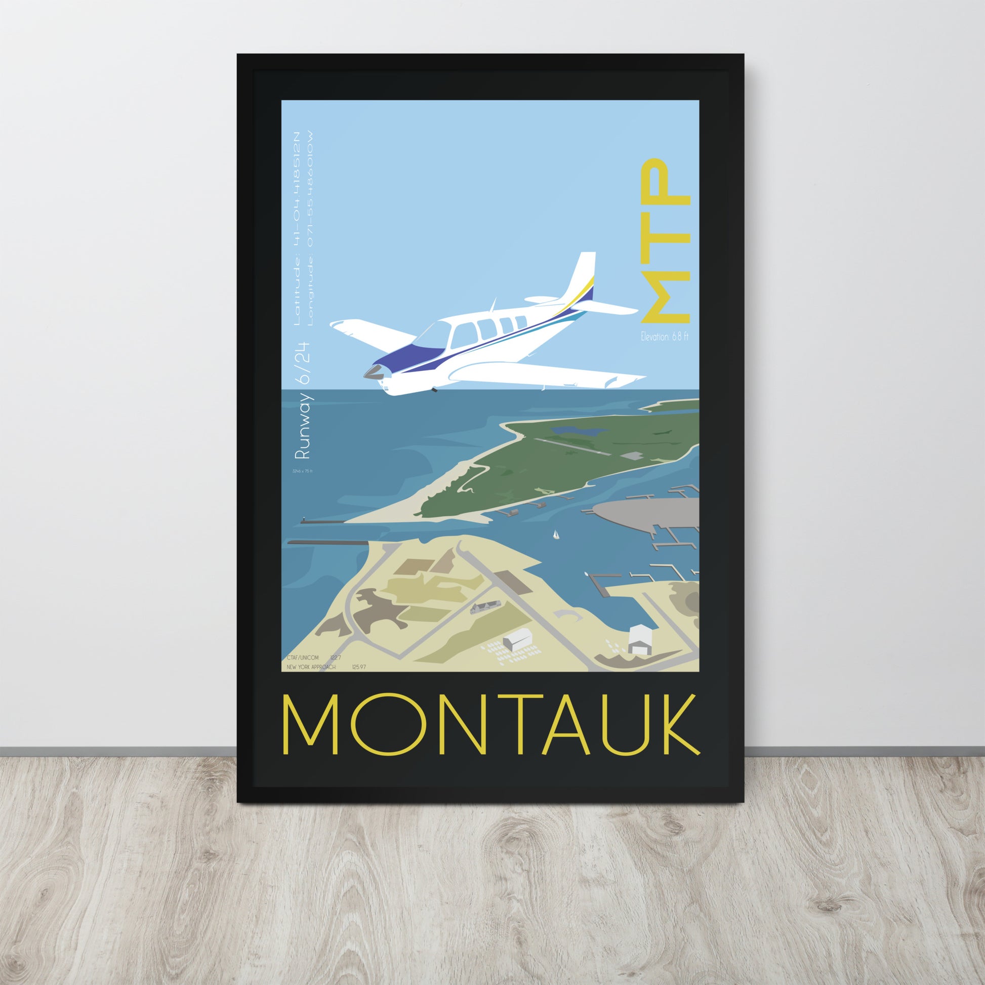 Framed poster 36x24 inch - Montauk Airport, New York - Bonanza A36 - Vintage Aviation Retro Graphic