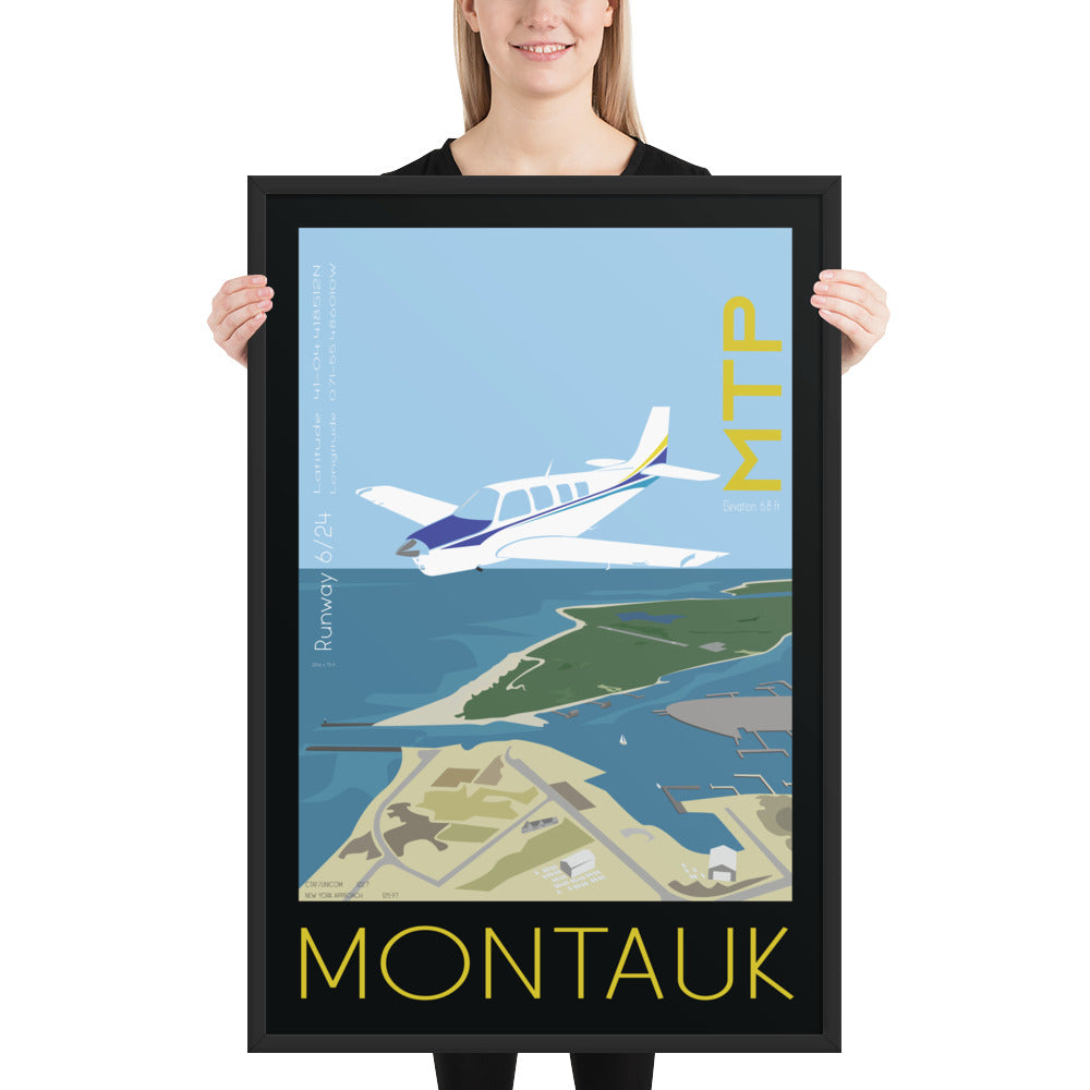 Framed poster 36x24 inch - Montauk Airport, New York - Bonanza A36 - with our exclusive Vintage Aviation Retro Graphic
