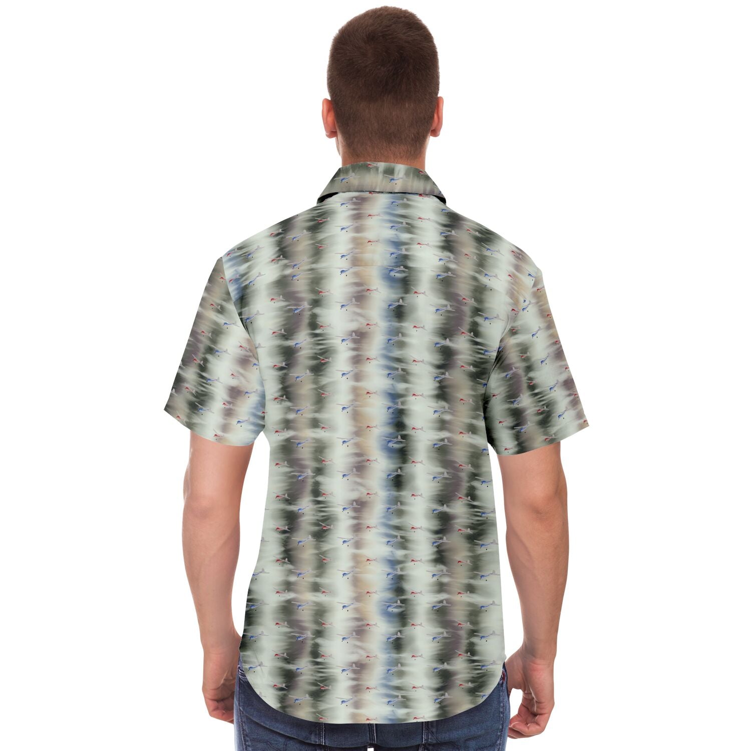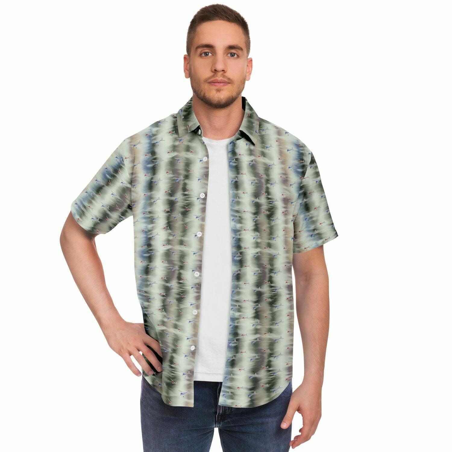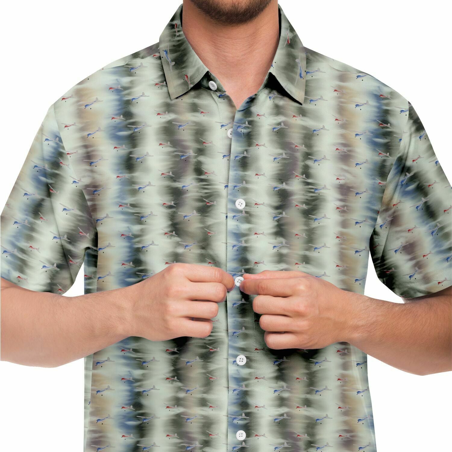 Made to order button-down shirt CESSNA 140, with a trendy tie-dye background and a classic and fun Cessna 140 polished silver aircraft pattern. Spread collar, short sleeve button down shirt great for every day and occasion.